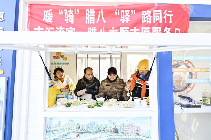 “志汇湾家”暖新驿站内,快递小哥、外卖骑手聚在一起吃饺子话家常,在节日中感受温情暖意。记者唐建/摄